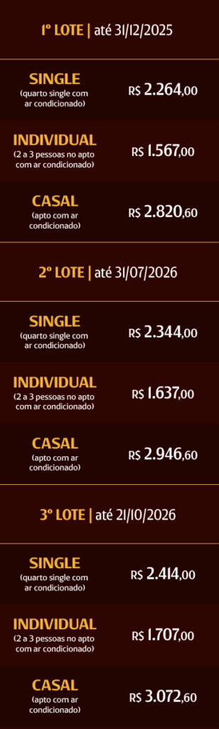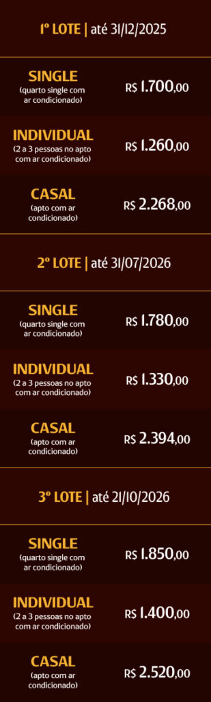 Os preços incluem: a participação no congresso, a hospedagem no hotel selecionado e as refeições constantes no programa (se a inscrição for com hospedagem) – eles não incluem bebidas e extras no hotel.