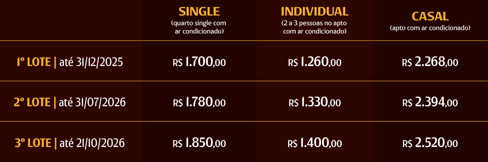 Os preços incluem a participação no congresso, a hospedagem no hotel selecionado e as refeições constantes no programa. Eles não incluem bebidas e extras no hotel. Em caso de desistência, será retido o valor de R$ 150,00 por pessoa.