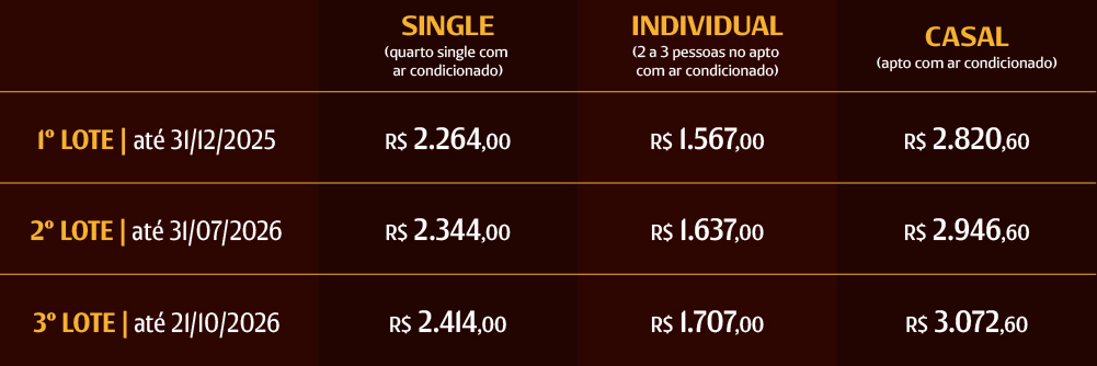Confira as condições de parcelamento e as opções com ou sem hospedagem