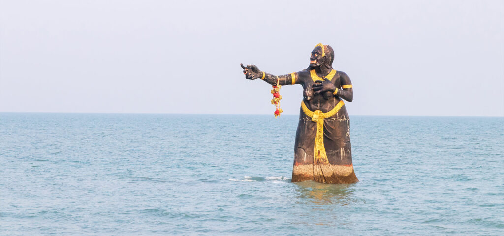Logo ao chegarmos no cais, no entanto, em meio a toda a beleza, fui surpreendido por uma imagem de mais de dez metros de um ser que parecia com uma sereia, mas tinha um rosto assustador. Não só seu semblante era de raiva, mas tinha presas que saíam de sua boca. Pelo que entendi, trata-se de Phisuea Samut, uma ogra do mar, personagem de um poema mitológico tailandês que se apaixona por um príncipe, o herói da história. Transformando-se em uma linda mulher, ela seduz o herói e se casa com ele. Na história, ele finalmente descobre quem ela é e foge da ilha.