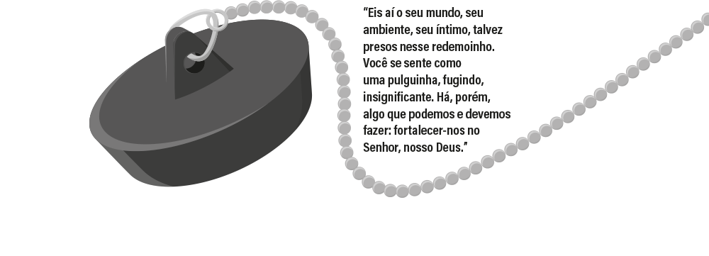 Eis aí o seu mundo, seu ambiente, seu íntimo, talvez presos nesse redemoinho. Você se sente como uma pulguinha, fugindo, insignificante. Você também nada tem a opor à predominância de tudo o que é grande que acontece no mundo. Pode haver irritação com as decisões políticas, ressentimento com as injustiças que observamos diariamente, a interação com as pessoas em geral. Há, porém, algo que podemos e devemos fazer: fortalecer-nos no Senhor, nosso Deus.